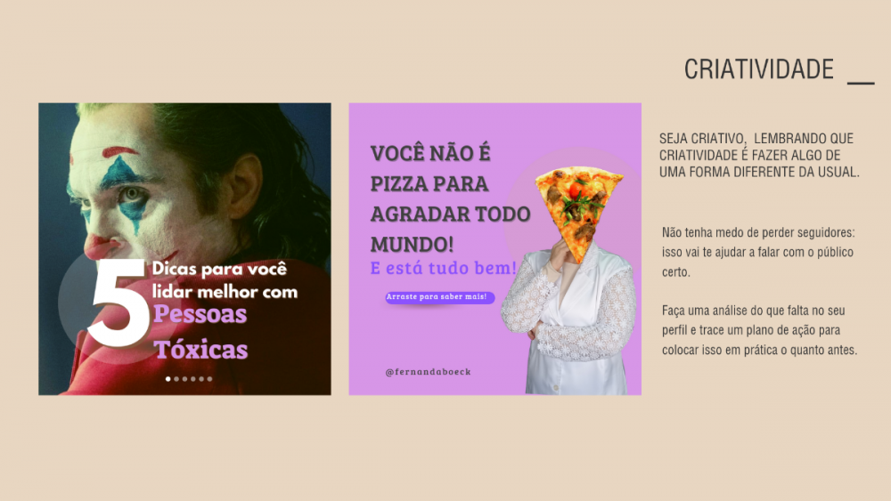 Fizemos por aqui dois posts diferentes com estratégia de collab com os próprios seguidores. Em um, propomos um compartilhamento de frutas nos stories (utilizando um hábito e uma expressão da influenciadora) e avisamos que ela escolheria alguns para postar no seu próprio Instagram e inspirar as pessoas. Em outro, utilizamos a dúvida de muitas seguidoras sobre o cuidado com os cabelos e a atividade física, mas reconhecendo que a influenciadora não sabia e pedindo as indicações das próprias seguidoras. Os resultados: POST FRUTAS 1434 curtidas 42 comentários Post cabelo: 4002 curtidas 59 comentários disso tudo: Post inspiração já prevíamos o resultado não tão alto (para os nossos padrões, pq mil pessoas é muito haha) mas insistimos por saber que daria alcance externo com menções em stories e que isso seria muito bom para fortalecer o relacionamento com as seguidoras. Post de dicas já prevíamos que seria muito curtido e muito salvo, afinal é um “guia” para se ter à mão. Além disso, traz a vulnerabilidade do “não sei sobre tudo”, a humildade do “me ensine” e a gentileza do “vou compartilhar sua dica para que mais pessoas saibam”.1 ponto