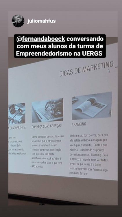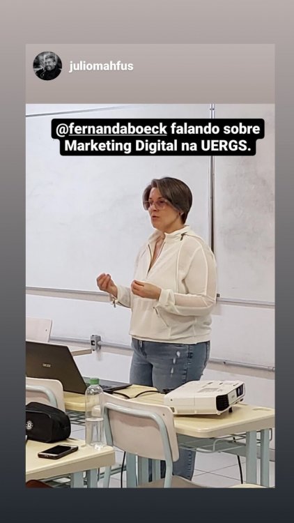 Olá, Beselhas! Semana passada dei uma aula de Marketing e Estratégias de Conteúdo para uma turma do Curso dd Administração da UERGS -Universidade Estadual do Rio Grande do Sul, CAMPUS Cachoeira do Sul. Sou médica psiquiatra e contei minha história de sucesso no Instagram, com a ajuda da FEC e do Portal e da Comunidade Paulo Cuenca. Compartilho com vocês aqui, fotos da aula e o conteúdo que apresentei. Foi uma experiência incrível!1 ponto