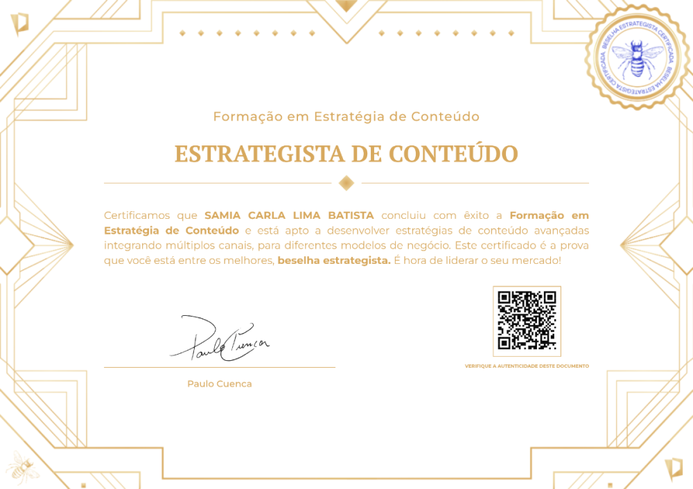Gente, conseguir o certificado de Estrategista de Conteúdo da FEC é muito gratificante, neste momento eu me sinto muito mais capaz de colocar todo o conhecimento adquirido em prática e fazer a diferença na minha vida e na vida dos meus clientes! Gratidão @paulocuenca e todos da Colmeia Bora Voaaaarrrrr1 ponto