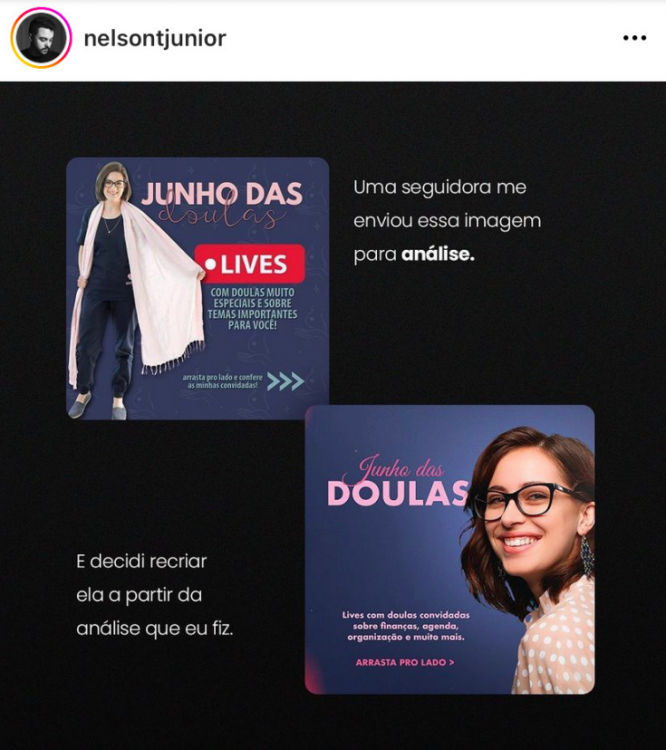 7. Oi Eduarda! Algo que facilita MUITO na hora de fazer um bom design é usar os princípios do design Vou exemplificar com o post que você tem fixado. 1. Alinhamento Fica mais agradável aos olhos se o texto inteiro estiver centralizado ou inteiro a esquerda e não variado como está. 2. Proximidade É bom que as informações similares estejam próximas. Se elas estão espalhadas fica confuso na hora de ler. Como foi o caso de separar a frase "... liberdade e poder de escolhas" e "através da educação..." 3. Contraste Dar destaque ao que mais importa, entra o que o @Breno Barcelos Design falou sobre as cores, mas também tem haver com o que a @Blenda Reis citou sobre hierarquia. Na minha opinião, se o seu perfil fala sobre educação financeira, essa parte deveria ter um destaque maior que o "bem vinda", por exemplo. 4. Respiro Aqui entra o que o @Breno Barcelos Design comentou da imagem estar atrás, tem muita informação aglutinada e para ficar mais bonito e fácil de ler seria bom ter esses respiros e menos elementos. Se você pretende continuar fazendo o próprio design dá uma olhada no conteúdo do Nelson Junior: https://www.instagram.com/nelsontjunior/ Ele é um ótimo professor e ensina esses 4 princípios muito bem! Um exemplo de tudo que eu citei, que ele aplicou na imagem de uma seguidora: Virou um texto gigante, né? rs, mas espero ter ajudado!