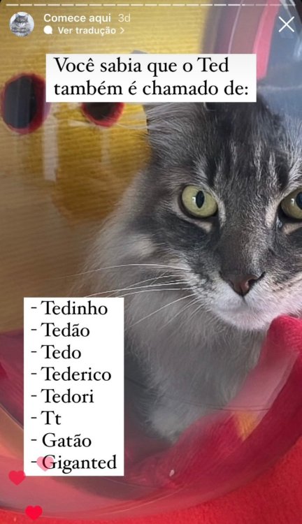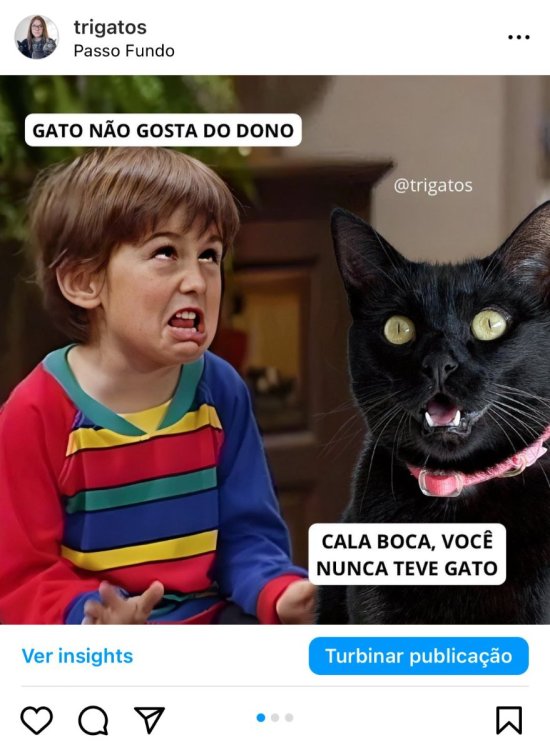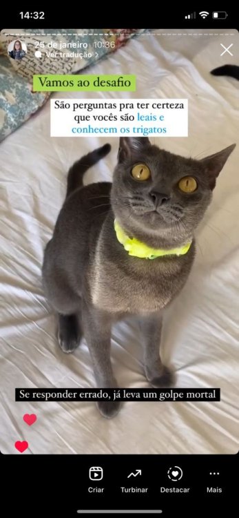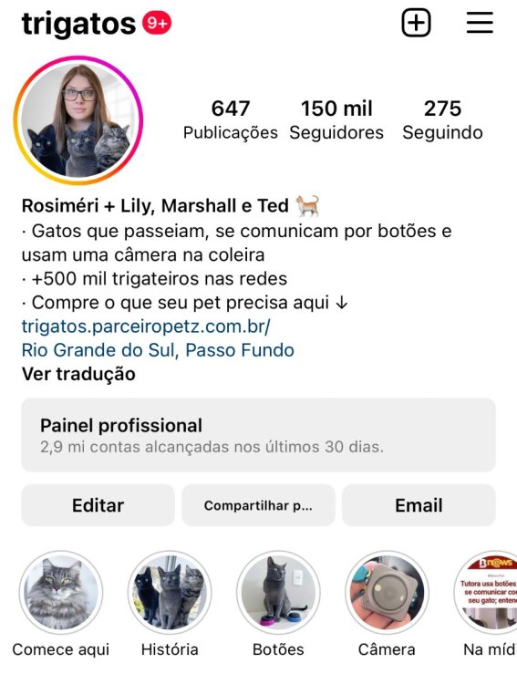 Eu já tinha mudado a bio, foto de perfil e criado o destaque "comece por aqui" enquanto fazia as aulas da FEC, aproveitei o desafio pra atualizar tudo e melhorar mais ainda. Link do perfil: https://www.instagram.com/trigatos/ Ficou assim: O destaque "comece por aqui" eu fiz há cerca de um mês, ele fala sobre mim, meus gatos e meu noivo (somos todos "personagens" que aparecem no perfil), além disso, explica sobre o que é o meu conteúdo, como funciona o perfil e as minhas crenças. O resultado já tinha sido muito legal e gerado muita conversa, teve 17 telas, 125 respostas no total e 72 compartilhamentos. Nessa atualização, resolvi colocar alguns apelidos que eu dei para os meus gatos e o resultado foi melhor ainda, teve 4 telas, 130 respostas no total e 22 compartilhamentos.