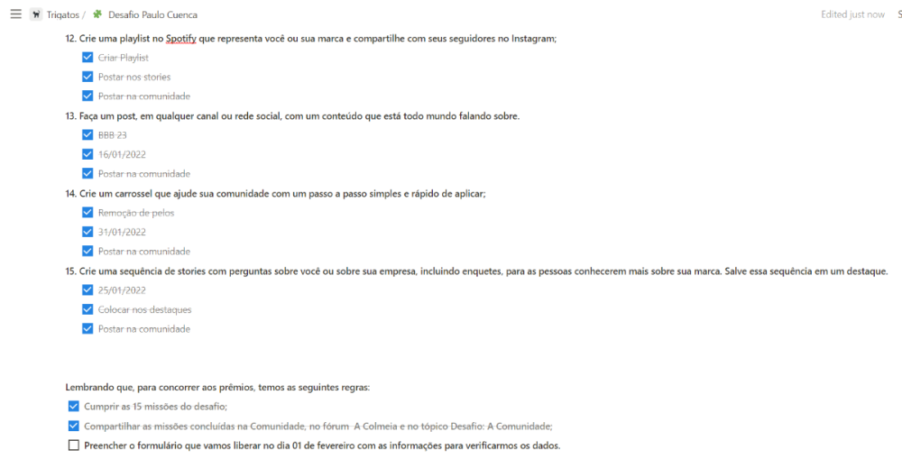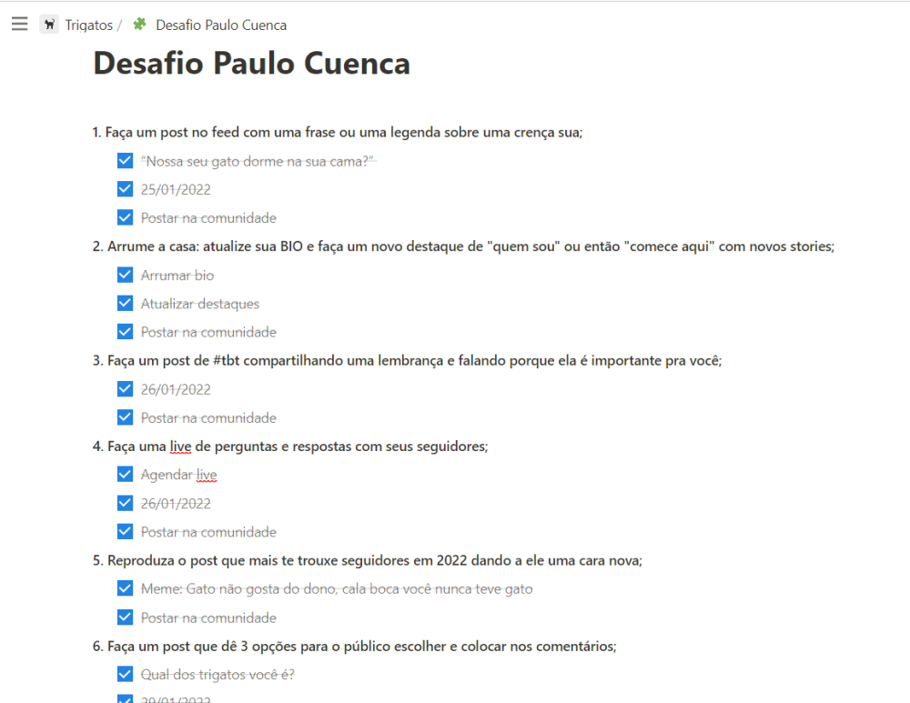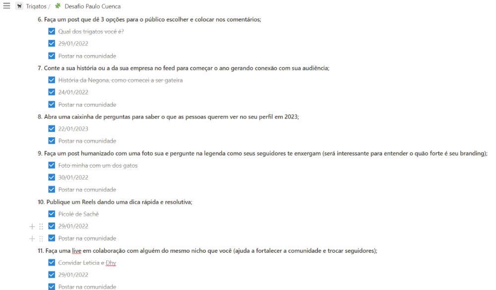 Terminei hoje o desafio e tenho que dizer que não poderia estar mais satisfeita com os resultados. TODAS as métricas do desafio melhoraram, todos os posts que fiz pro desafio foram acima da minha média, independente do resultado, eu já ganhei muuuito com a experiência. Vou deixar o print das métricas aqui, tanto pra incentivar as pessoas a cumprirem os próximos desafios, quanto pra dizer que estou muito orgulhosa: Eu fiz junto com a minha estrategista @Andressa Maria Tonin e já estamos ansiosa pelos próximos desafios hahahahahah E pra conseguir me organizar e fazer tudo o que precisava fazer, eu criei um checklist no Notion:
