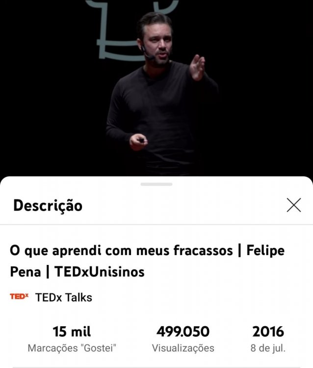 "O Fracasso é muito solitário" "O Fracasso não tem amigos" "Enquanto o sucesso a gente divide com todos, o fracasso é solitário, é só nosso". TEDx Felipe Pena - O que aprendi com os meus Fracassos Um TEDx com Felipe Pena, para refletirmos sobre o fracasso. Há tempo que assisti, e acho bem interessante. O que você aprendeu com seus Fracassos?