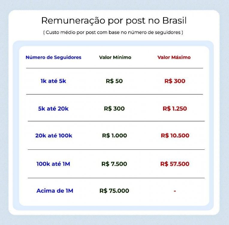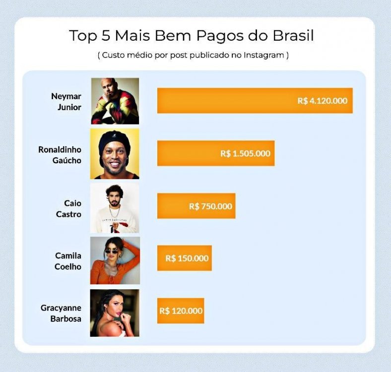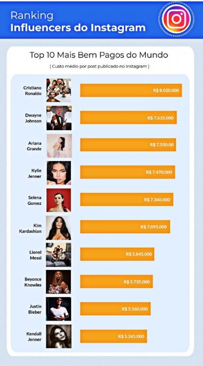 De março/2022 Com mais de um bilhão de usuários, o Instagram é hoje uma das principais redes sociais do planeta (na verdade, é a terceira colocada no ranking). Com essa população todapassando em média 29 minutos diários em frente ao aplicativo, é natural que o espaço se tornou um dos mais procurados para as grandes marcas para divulgar os seus produtos e serviços. Acostumados a uma “dança” cotidiana de influencers, pouca gente sabe que alguns deles chegam a conquistar centenas de milhões de seguidores, o que pode determinar o impressionante número de R$ 8 milhões pagos por uma única postagem. Ao analisar o topo supremo do ranking mundial em faturamento no Instagram, percebemos que o campeão de rendas é o jogador português Cristiano Ronaldo que, não por acaso, cobra – e recebe – por post a quantia de R$ 8,02 milhões. O segundo colocado, o ator americano Dwayne Johnson (que já foi o ex-lutador The Rock) cobra R$ 7,6 milhões por post, enquanto a terceira colocação no “pódio” vai para a cantora americana Ariana Grande, com R$ 7,55 milhões por postagem. O ranking no Brasil conta com valores mais modestos, mas também é dominado por celebridades e atletas. O jogador Neymar é o primeiro colocado, seguido de Ronaldinho Gaúcho. O Top 5 é fechado por Caio Castro, Camila Coelho e Gracyane Barbosa. Fonte: https://www.tecmundo.com.br/internet/235054-veja-ranking-10-influencers-faturam-instagram.htm