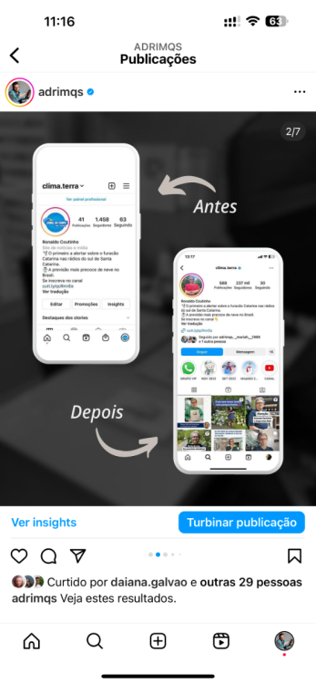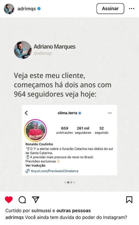 3. Olá pessoal, eu sou Adriano Marques, @adrimqs no Instagram. Participei da turma 4 do Superpoder, iniciando em janeiro de 2020. Desde então, conquistei diversos clientes, incluindo alguns de grande porte, sobre os quais posso falar em outra ocasião. Hoje, gostaria de destacar um cliente em particular com quem trabalho há 4 anos. Começamos praticamente do zero, pois o perfil contava apenas com 964 seguidores quando iniciei as postagens e a aplicação das estratégias aprendidas com Cuenca. Em oito meses, alcançamos 30k seguidores de forma totalmente orgânica no @clima.terra. Vale ressaltar que, durante os dois primeiros anos, as postagens eram estáticas e ocorriam apenas duas vezes por semana. No ano passado, em apenas três meses, atingimos a marca de 120k seguidores. O cliente, que hoje conta com impressionantes 263 mil seguidores de forma orgânica, enfrentou desafios, especialmente pela resistência em gravar vídeos e se expor no Instagram, algo compreensível considerando seus 60 anos de idade. Foram necessários dois anos para convencê-lo, mas ele compreendeu, aceitou e agora está totalmente engajado, dentro das possibilidades que possui. O resultado é evidente: conquistamos uma audiência de 263 mil seguidores organicamente, sem recorrer a tráfego pago, e ainda temos um potencial de crescimento significativo. Estou ansioso para participar em breve da mentoria do Cuenca, pois minha estratégia tem se mostrado eficaz. Isso só foi possível com o apoio da esposa e do filho, que desempenham um papel fundamental nos bastidores. Alcançamos dezenas de vídeos com mais de 300 mil visualizações, alguns ultrapassando 1 milhão. Até mesmo nosso canal no YouTube, que tinha 30 mil inscritos, hoje conta com 184k, incluindo uma placa pelos 100 mil inscritos - uma conquista que me enche de orgulho. Este é um breve resumo, mas acreditem, o caminho pode ser desafiador. Como Cuenca sempre destaca, haverá momentos de dificuldade e demora para ver os resultados financeiros. No entanto, o método funciona, como pude comprovar em outra empresa, sobre a qual falarei em outro momento, caso Cuenca considere relevante. A idade não é um impedimento; tenho 44 anos, e a dedicação é o segredo. O sucesso é real, então, sigam em frente. Permitam-me uma sugestão como aluno antigo: nas lives, deixem Cuenca falar e evitar perguntas repetitivas. Ele tem muito conhecimento para compartilhar e, ao permitir que ele se aprofunde, todos nós saímos beneficiados. Já atendi diversas áreas, e posso afirmar que o método se aplica a tudo. Alguém pode questionar o tamanho do meu Instagram e o engajamento, e é verdade, preciso melhorar, mas meu foco sempre foi aprender e aplicar nos clientes. Aqueles que me deram a oportunidade de trabalhar alcançaram resultados positivos. Também estou comprometido em melhorar meu próprio perfil, se o tempo permitir. Segue dois prints recentes para que vocês possam conferir os números mencionados anteriormente, que já sofreram um aumento desde então. Vamos juntos, e obrigado pela atenção!