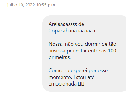 Que felicidade Nathalia, parabéns. Estou chegando em casa somente agora. Me conta, onde foi divulgado os 100 primeiros?
