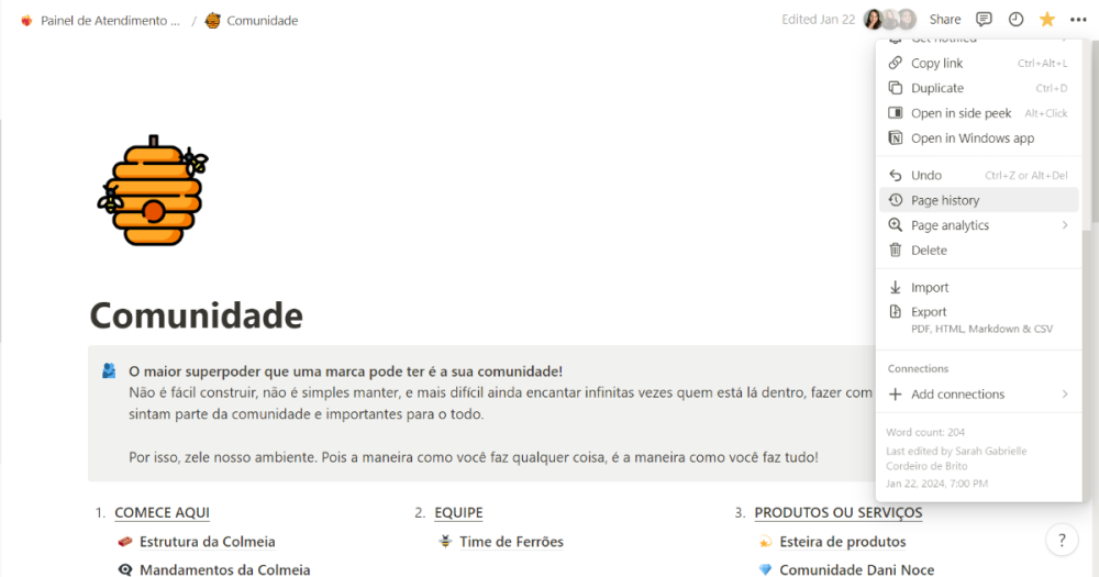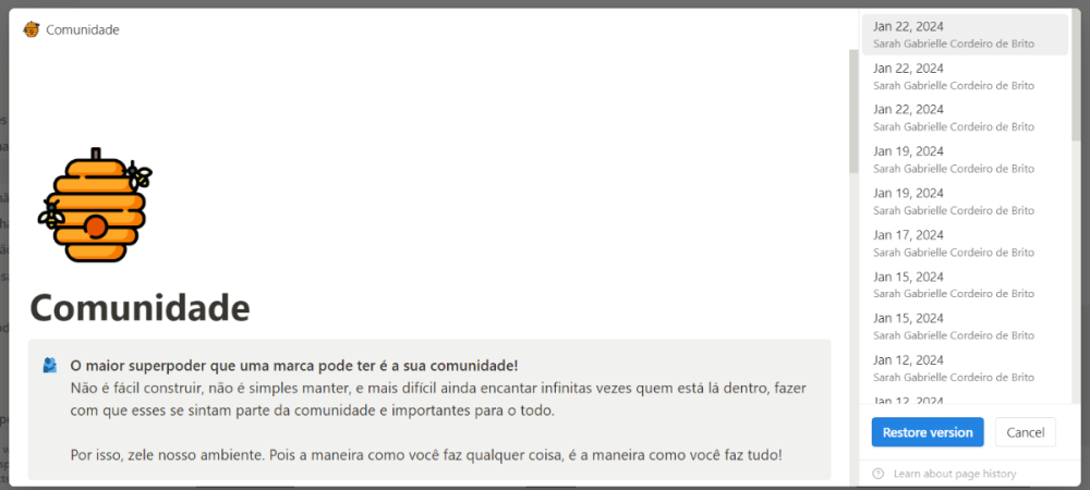 Olá, Colmeia! Tudo bem? Sei que o Notion é um verdadeiro desafio para vocês, e hoje tive um pedido de ajuda que pode acontecer com muitos de vocês. Segundo minha mãe: só não tem jeito para a morte, e o ser humano ainda descobriu um jeito de ressucitar. Então relaxa que seu problema tem jeito. Resolvi trazer o passo a passo aqui de como restaurar uma página perdida. A primeira dica é, duplicar a página que você já modificou, pois depois de apagar os dados sem querer, você já deve ter feito alguma mudança que também não quer perder. E para duplica é só clicar nos 3 pontinhos da própria página. Depois de duplicar, volte a página original, clica nos 3 pontinhos da lateral direita de novo, e clica em "page history" que é "histórico da página". Então é só procurar a versão anterior que você quer resgatar e clicar em "restore version", prontinho. Agora você tem a versão que perdeu e a versão que já tinha sido modificada depois disso. Aqui as imagens que podem te ajudar. Aproveitando aqui, o que mais gostaria de saber sobre o Notion que você não sabe? Pode ser qualquer funcionalidade, inclusive como colocar o seu para o Português. Aguardo sua dúvida nos comentários!