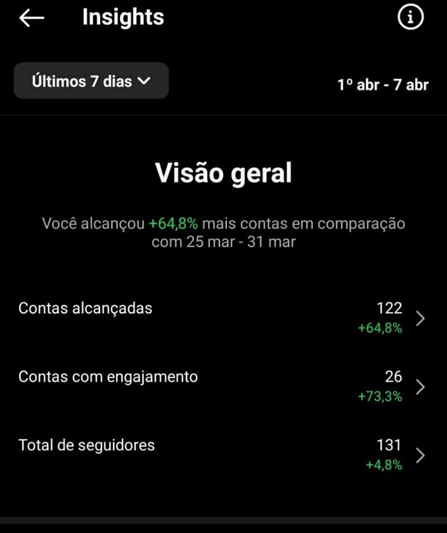 Ois oiisssss genteee! Vindo aqui falar um rápido depoimento, uma percepção minha após os estudos também do superpoder né haha Semana passada retrasada teve a páscoa, e eu decidi testar fazer a semana toda nesse tópico, já que nunca havia feito. Trabalhei com conteúdo PICAH, com as crenças, objeções, usei e abusei da minha marca hahah mas o retorno não aconteceu... Cheguei ao final, fiz as observações e comecei a semana passada com outros conteúdos. Como esperado um dos primeiros não teve muito feedback, mas continuei com os demais da semana. No final, voltei a ter os números subindo... Porque agora assim estava falando com meu público! Agora assim voltei aos trilhos do que eles querem mesmo! Mas o depoimento aqui é, fora o aumento dos números, é a observação, os testes que são importantes de serem feitos pra gente saber também o que pode dar certo, e como mais podemos expandir nossa forma de criar uma comunidade e obter o que desejarmos, seja venda, clientes, engajamento, etc; Até porque penso que manter o perfil no mesmo lugar te faz ficar para trás... É importante a inovação! Segue o print do insight rápido do final da semana passada em comparação a da páscoa: