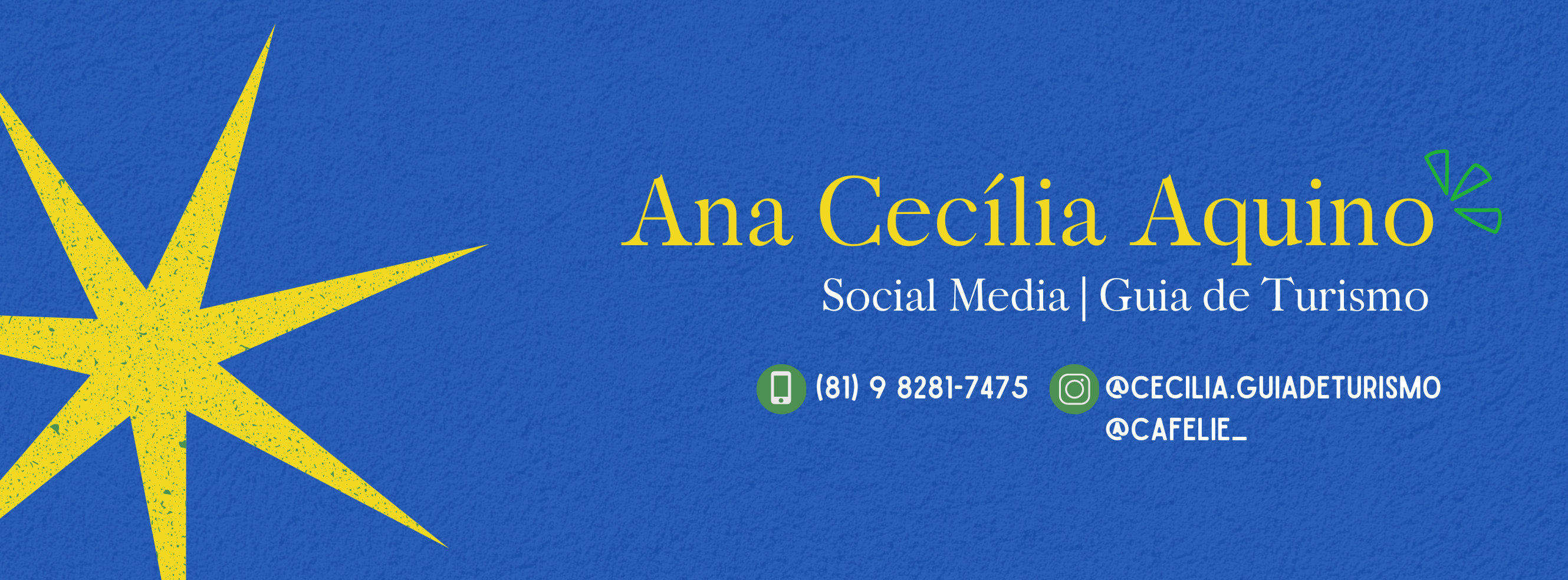 Me chamo Ana Cecília, tenho 29 anos sou formada em Publicidade e Propaganda, e tenho curso técnico em Guia de Turismo. Atualmente atuo como Social Media, também como Guia de turismo, e além disso tenho uma cafeteria com minha mãe na cidade de Olinda/PE.