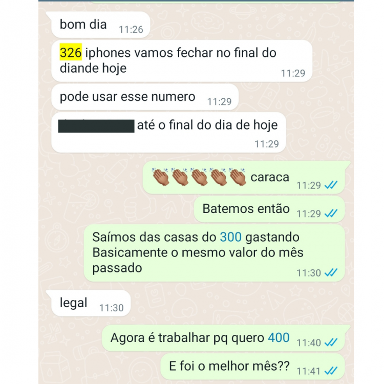 12. 326 Iphones vendidos com R$4.672,41 investidos. Mais de 800 mil reais faturados. Atualmente entre os mais de 30 clientes que temos, o maior nicho é o de vendas de Iphones, são 12 clientes e mais de 300 mil investidos somente nesse nicho. Batemos mais esse recorde de vendas com cliente. Focamos muito forte em Frequência e Remarketing, alinhado a equipe de vendas do cliente que é absurdo. Campanhas de direct se mostraram o melhor modelo, com raio de 30 km da empresa (isso em SP que é a maior concorrência do país) Durante 15 dias fizemos campanhas de tráfego para página e alcance com frequência de 3 a 4 e peguei o público de 7 e dos 15 que tinha visto e já fiz campanhas de vendas por mensagens no direct. Criativos simples são ótimos para melhorar a qualidade do lead, unido a nossa experiência no nicho ajudou a aumentar a qualidade dos clientes. A equipe de vendas foi essencial trabalhando esses leads e somente depois mandando para o WhatsApp. Mostrei nos meus stories as campanhas, se fizer sentido me sigam no Instagram. https://www.instagram.com/misaelmaramaldo/ Espero ter ajudado! Vlwwwwww