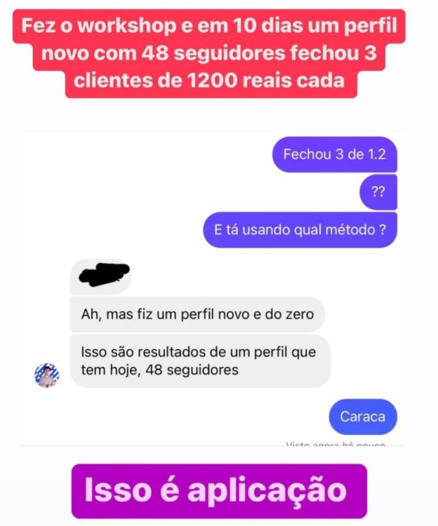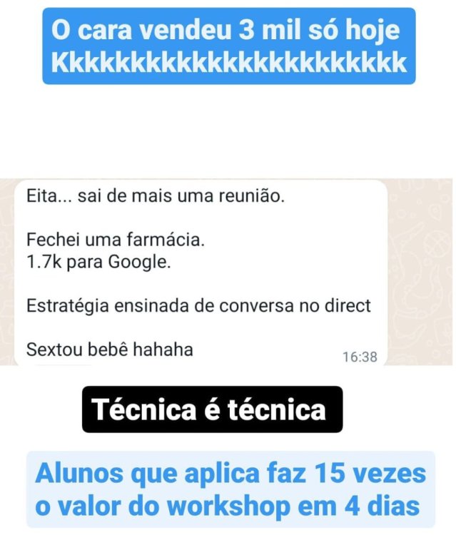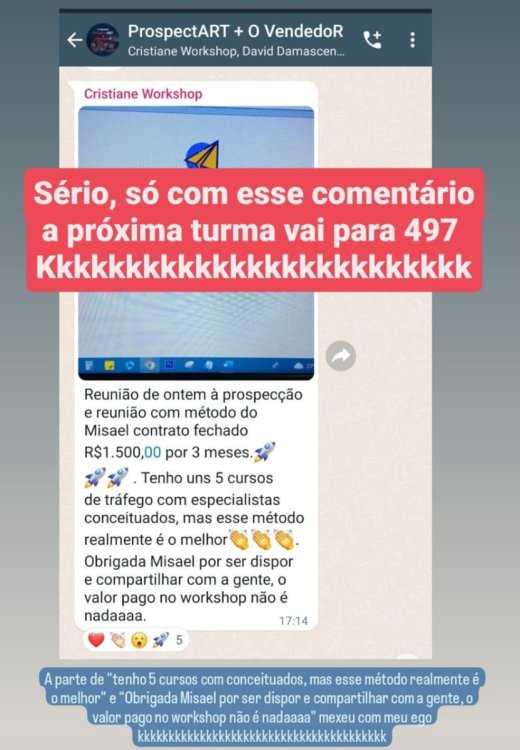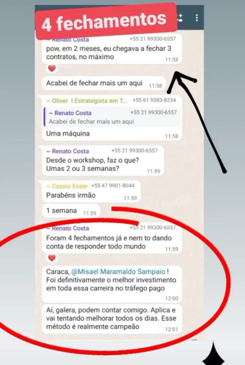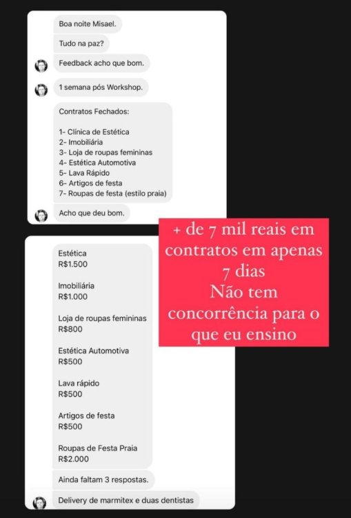 2. Depois de faturar mais de 300 mil como gestor de tráfego apenas prestando serviços resolvi ajudar alguns gestores de tráfego com dificuldades em prospecção e vendas. Eles queriam entender meus métodos de prospecção e vendas sem usar tráfego, e depois de muita insistência meus 9 módelos de prospecção orgânica fiz um Workshop de 2 dias e cobrei 197 reais a ideia era entregar tudo que eu faço a 1 ano e 9 meses na minha empresa que hoje tem mais 44 clientes ativos. Uma coisa é você fazer para si mesmo, outra é ensinar, e para minha surpresa o resultado dos alunos foi absurdo, tendo alunos fechando 7 clientes em 1 semana, outros mandando mensagem me dizendo que ajudei a salvar o negócio deles. A minha felicidade nem é pelo valor, atualmente meus clientes são suficientes para custear o que preciso com meus colaboradores, mas a alegria de saber que meus 9 métodos de prospecção ôrganicas funcionam não somente para mim mas para outras pessoas. Vim dividir em forma de agradecimento e dizendo para vocês que o mercado ainda tem milhares de oportunidades e "tem dinheiro para recolher com pá" é só não desistir. Meu instagram é @misaelmaramaldo https://www.instagram.com/misaelmaramaldo/ Mostro meu dia a dia por lá inclusive os resultados dos alunos que não param de chegar.