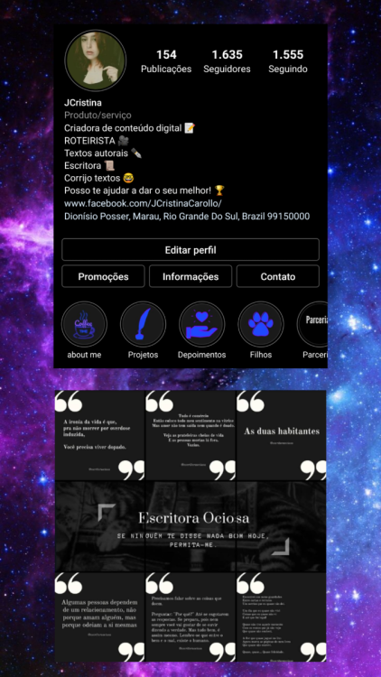 Como as imagens não estavam carregando, não caprichei. Então estou respondendo o tópico com os prints da minha bio, pra quem quiser ler e quem sabe se inspirar