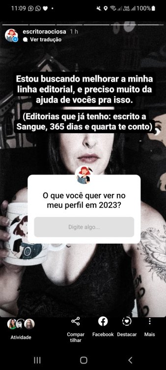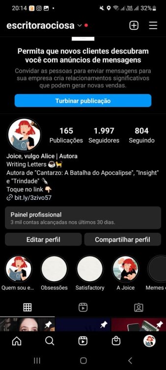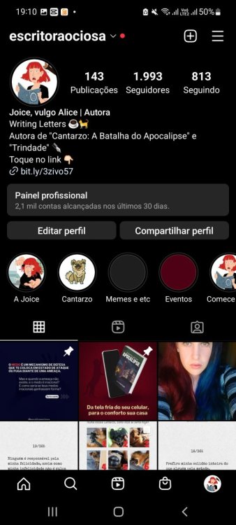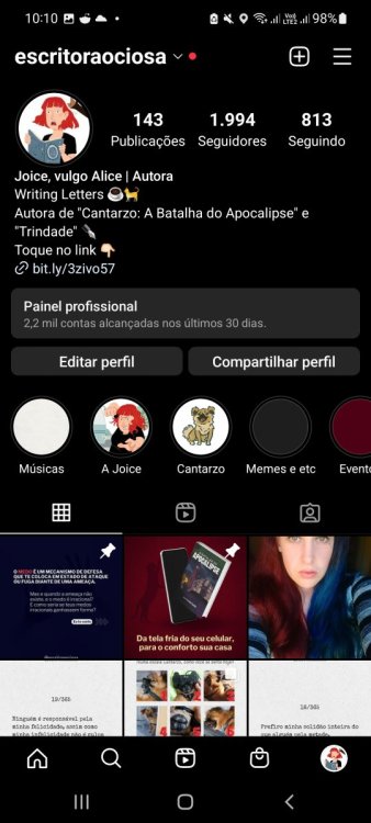 Eu percebi que não vejo as notificações Acredito que normaliza logo hahahaha A minha bio: Writing Letters ️ Autora de "Cantarzo: A Batalha do Apocalipse" e "Trindade" Toque no link __________________________________ O texto do destaque eu não consigo encontrar Acho até que apaguei. Mas vou deixar o link aqui https://www.instagram.com/p/CnwjIKVvUuq/?igshid=Yzg5MTU1MDY=