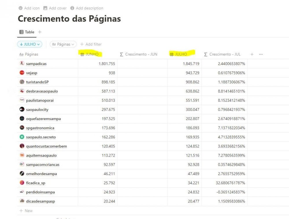 Bom, graças a ajuda de vocês e também fuçando um pouquinho mais, encontrei este link e consegui criar a formula. a formula é esta: (prop("Number 2") - prop("Number 1")) / prop("Number 1") Onde "Number 2" e o "Number 1" você sustitui pelas informações da sua tabela, vejam o exemplo do que fiz aqui: Com isto consigo aompanhar mensalmente em % o crescimento meu e dos meus concorrentes. O link de onde vi estas informações está aqui: E espero ter colaborado com todos que me responderam e até com aqueles que por ventura desejam também- 12 respostas