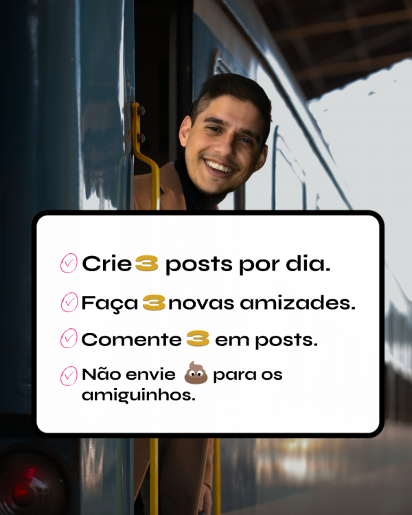 HAHAHAHAHA eu coloquei no meu checklist assim. - Comentar 3 posts - Fazer 3 novas amizades - Interagir com 3 novas pessoas - Criar 3 posts na comunidade. Já salva para usar Ste -