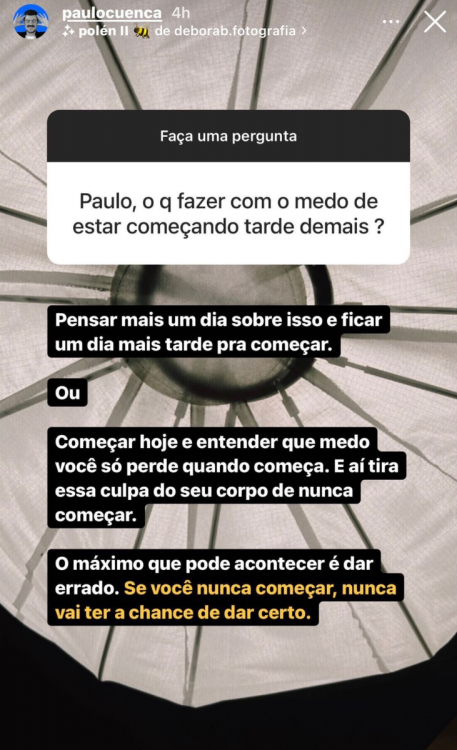 Aff, eu aprendo demais com os stories do Paulo. Várias das respostas que ele dá servem pra mim. Inclusive tenho o print de uma resposta que ele deu um tempo atrás, que foi uma virada de chave danada pra mim, é essa aqui: -