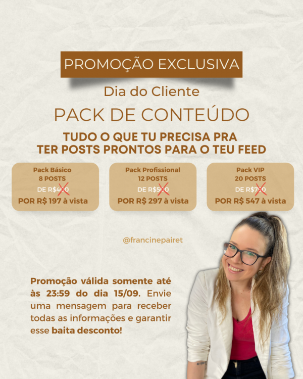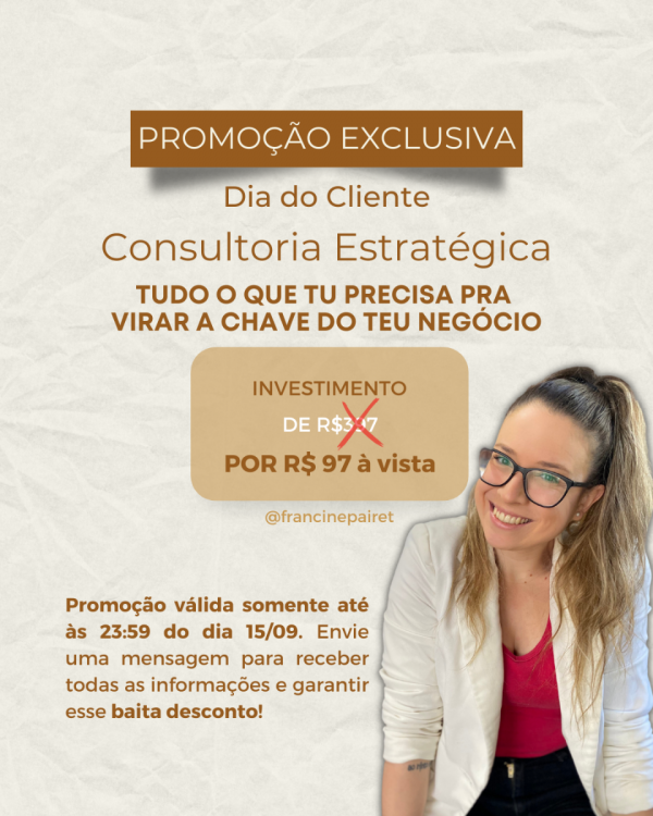 Hoje é o dia do cliente! E pra aproveitar essa data, criei duas ações: • Para captação de novos clientes: nessa etapa lancei uma promoção que vai ao ar até as 23:59 de hoje, onde de R$397 a minha Consultoria Estratégica de Instagram está por R$97 (até agora já realizei 4 vendas) • Pós venda com outros produtos: entrei em contato com TODOS os clientes que já atendi através de consultoria e mentoria para oferecer meu pack de conteúdo também promocional (já realizei uma venda de R$547 com um pack de 20 posts) O que isso me ensinou? Que eventualmente podemos fazer promoções relâmpago e também valorizar aqueles que já confiaram um dia no nosso trabalho! Ter esse contato, essa troca e se fazer presente é fundamental para o relacionamento com o cliente. As vezes o nosso cliente precisa de outros atendimentos e não sabe por onde começar e se a gente apresenta uma solução pra ele, ele acaba fechando contigo! Segue print da cliente que fechou comigo o ticket mais alto das promoções que lancei para hoje e também as duas das artes que criei para realizar as vendas (fiz carrossel com mais informações de cada uma delas, quem quiser ver me envia uma mensagem que mostro) -