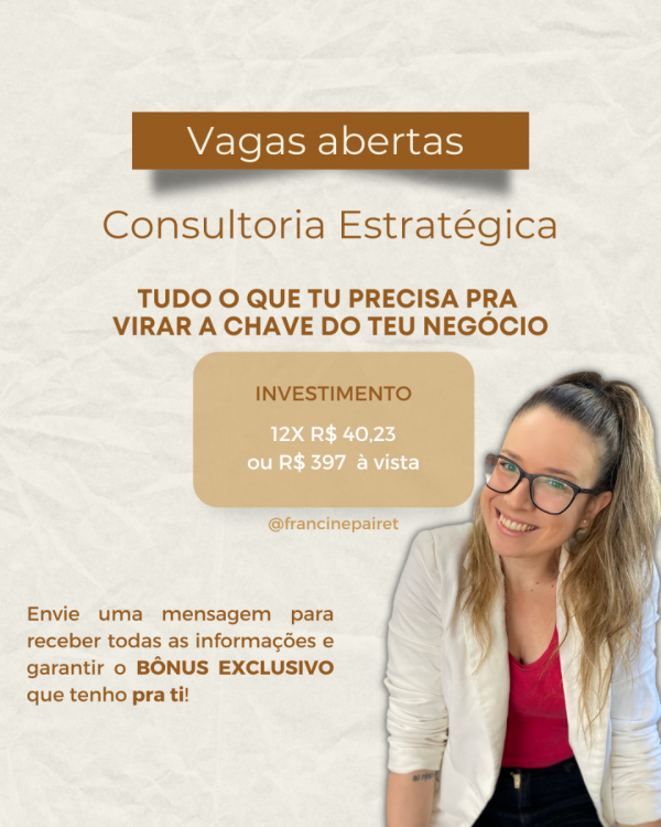 Oi, pessoal! Tudo bem? Sou a Fran, formada em Relações Públicas e trabalho com criação de conteúdo há quase 10 anos. Em 2021 tive que me reinventar por conta da pandemia, acabei perdendo meu cliente principal em que eu atendia como Social Media e me vi sem renda. Devido a isso, comecei a atender com consultorias, criei tudo do zero, fui testando e fazendo o que precisava pra fechar os valores das contas do mês. Mas por conta disso, finalmente tive coragem de atuar com consultorias e desde então, trabalho dessa forma! Já atendi mais de 100 negócios e 3 mentorias individuais, onde eu ensino absolutamente tudo sobre o Instagram, seja para quem quer começar a trabalhar com isso ou para aquele microempreendedor que ainda não pode investir em um profissional e precisa aprender a utilizar a plataforma. Isso foi somente um resumo pra explicar o que busco aqui: pessoas que realmente tenham interesse em participar da minha primeira turma teste de mentoria! Nela ensino como tu pode ter um perfil mais estratégico para o teu negócio, desde a bio até os conteúdos que irão te ajudar a atrair mais pessoas e consequentemente se conectar mais com elas. A mentoria será online com 6 aulas iniciais, todas com pdfs de apoio e exercícios para serem feitos, afinal, precisamos praticar para aprender, não é mesmo? Quais serão os módulos vistos em nosso encontro: Foto de perfil O Google do Instagram Bio responsiva Destaques Link encurtado Definindo o teu público Quem tiver interesse por favor, deixa aqui o comentário. A ideia é fazer ela no sábado, dia 17/09. Eu poderia ter aberto isso nos meus stories, mas prefiro fazer esse primeiro momento com pessoas que já estão em busca de mais conhecimento e querem de verdade evoluírem na questão de conteúdo. Eaí, topa esse desafio? -