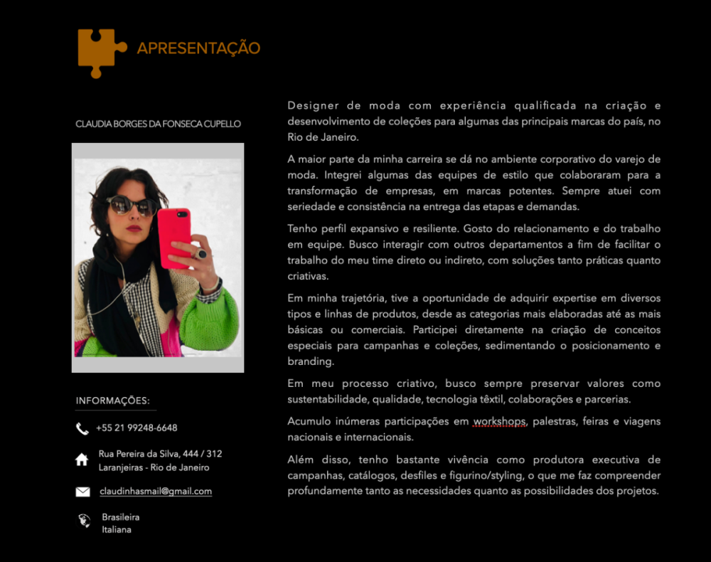 Olá comunidade! Me chamo Claudia Borges da Fonseca Cupello, e recentemente escolhi (ainda em dúvida) um nome artístico que é também o nome da minha conta no Instagram: Cloudie BR - @cloudie.br. Fico em dúvida se uso Claudie ou Cloudie e não consigo desenvolver a logo da minha marca por conta disso - por isso não consigo registrar ela também (Sofrimento). O que acham? Sou estilista, figurinista e stylist, trabalho com moda há 18 anos, a maior parte da minha carreira se dá no ambiente corporativo de moda. Integrei equipes de estilo, de algumas das maiores marcas cariocas. Logo antes da pandemia, desenvolvi um projeto artístico @moom.br que me orgulho profundamente e que concilia arte e moda. E corpos não humanos. O resultado visual é bem interessante e já tive inúmeros feedbacks positivos e apaixonados. Mas ainda tenho dificuldade de conceituar prática e poeticamente. Hoje me reconheço como uma pessoa de pulsões bem mais artísticas do que práticas e objetivas e tenho trabalhando neste reposicionamento social e profissional há 3 anos. Como toda artista, me sinto incompreendida várias vezes (risos), e ao mesmo tempo sinto vontade de me expressar mais, de ter mais audiência etc.. Eu gosto de dinheiro mas não gosto de como as relações se atropelam por conta disso. Já tive duas ideias de negócios plagiadas e tenho receio e muitas dúvidas sobre como publicar coisas no Instagram. Ao mesmo tempo tenho bloqueio mental para certas burocracias e por isso não consigo registrar na biblioteca nacional, daí acabo paralisando. Tenho 4 ideias bem bacanas que dariam startups de sucesso, estou procurando investimento e parceria. Por enquanto acho que é isso.. Prazer em chegar aqui, mesmo que atrasado rs bjs