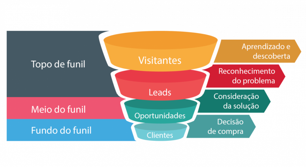 Diferentes estágios em que os potenciais clientes (ou leads) estão no processo de educação. O termo é uma metáfora para explicar o processo e cada uma das diferentes fases pelas quais passa o público da sua rede social. É importante criar conteúdo que possa alcançar parte do Funil. Fonte/Imagem: marketing.com.br