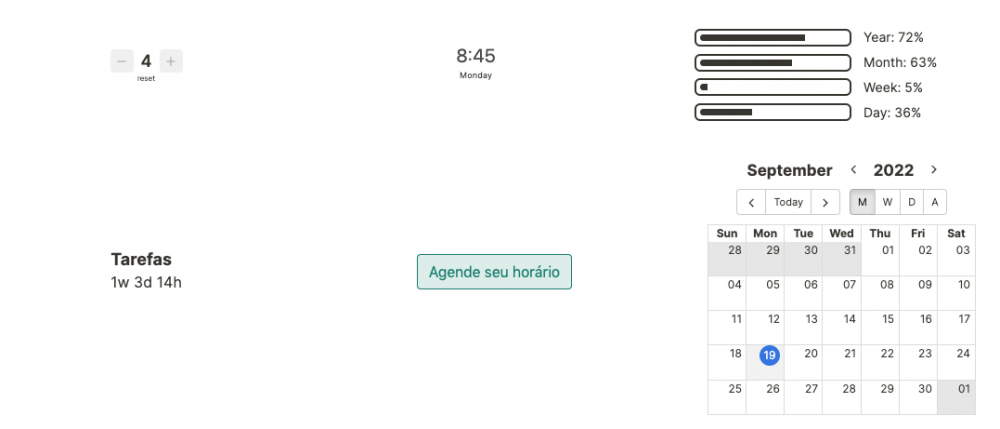 O diferencial do Notion é que nos permite organizar da forma que mais desejamos. Nesse site você vai poder criar e adicionar: - Botões - Barra de progresso de tempo em % (ex: quanto falta pro ano, mês, semana, dia acabar) - Relógio em vários formatos - Previsão do tempo - Quotes - Sincronizar o google calendário - Quanto tempo falta para um determinado evento ou tarefa - Contadores seja de tarefas realizadas ou tarefas não realizadas (por exemplo). Basta clicar em qual desses você vai desejar, criar de acordo com a sua preferência, copiar o link e colar no Notion, após você colar você clica em "create embeb". Alguns exemplos para vocês terem noção de como é: Vocês podem escolher o tamanho que desejam colocar, o calendário da foto é aquele sincronizado com o google calendar.