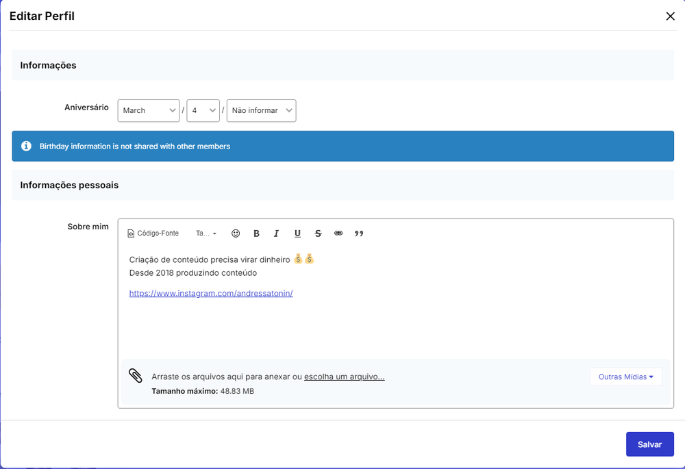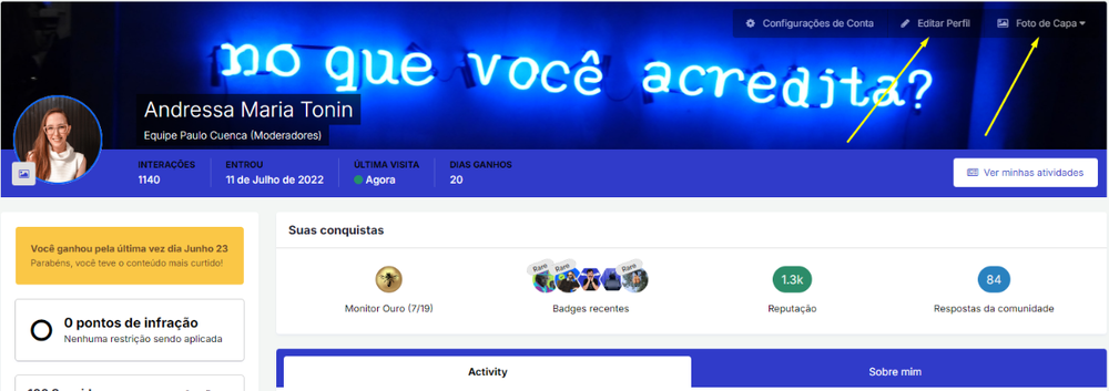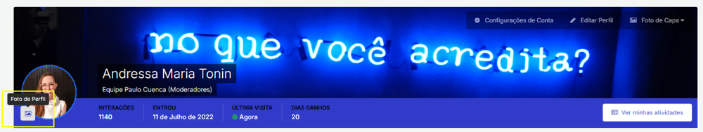 BOM DIA COLMEIAAAA! Bora começar o mês com tudo? Vocês sabem que a Comunidade é muito mais do que tirar dúvidas dos conteúdos, é uma rede de networking, troca de ideias, encontro de parceiros de negócios, collabs e por aí vai. E qual a primeira coisa que você vai olhar quando encontra alguém aqui na Colmeia? O perfil aqui dentro. E se não tiver nada? Então, convido vocês a dedicar um tempinho nesse espaço. Não precisa de um textão. Só precisa dizer o seu nicho, o que você faz e deixar seu @ para te encontrarmos fora da comunidade. Aqui embaixo tem um passo a passo pra facilitar! Conto com vocês. Aqui tem duas opções de edições do perfil “Editar Perfil” e “Foto de Capa” No “Editar Perfil” você vai adicionar o dia do seu aniversário, e um breve texto sobre você. Eu coloquei minhas principais crenças e o link do meu instagram. Escreva aqui algo que te representa! Pra adicionar uma Foto de Capa, vocês vão clicar no ícone de “Foto de Capa” e vai aparecer essa janela pra fazer o carregamento do arquivo do seu computador, ou celular. Depois disso é só reposicionar a foto para aparecer na capa da melhor forma. E por fim, mas não menos importante, escolham uma foto legal para colocar na Comunidade! Quem já vai personalizar seu perfil aqui na Comunidade? Se você já alterou, comenta aqui que eu quero ver as fotinhos e capa do perfil de vocês