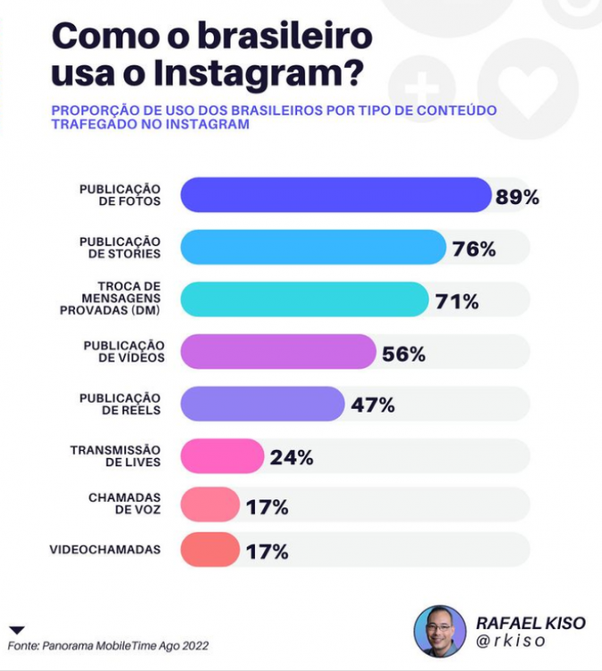 Esse post, me lembrou a trilha 2, onde o Paulo fala da quantidade de pessoas que fazem conteúdos no TikTok. Os dados mostram que os reels seguem a mesma lógica. Fiz alguns reels narrados, mas anda nenhum aparecendo. Vocês tem feito? "O Instagram está instalado em 86% dos smartphones nacionais - seis meses atrás eram 82%. Isso indica que o Instagram continua crescendo. Pelo sistema de mídia podemos conferir que o Instagram chegou a 125.6M de brasileiros. O Facebook está com 120.8M de brasileiros. Os dois juntos, descontando a sobreposição, chegam a 169.4M de brasileiros. O Instagram continua sendo um aplicativo mais presente nos smartphones das mulheres brasileiras (89%) que naqueles dos homens (82%). Apesar dos avanços do TikTok, o Instagram é também um app mais popular entre os jovens de 16 a 29 anos (88%) e entre brasileiros de 30 a 49 anos (88%) que entre aqueles com 50 anos ou mais (78%). ⚖Não há diferença relevante na análise por classe social. O número de usuários ativos diariamente também aumentou. Em seis meses subiu de 61% para 67% o percentual de usuários do Instagram que afirmam abri-lo todo dia. O hábito é mais comum entre mulheres (72%) que entre homens (61%). Quanto mais jovem, mais frequente o uso do Instagram: 72% dos seus usuários de 16 a 29 anos o abrem diariamente, ante 69% daqueles entre 30 e 49 anos e 54% do grupo com 50 anos ou mais. Em seis meses foram registrados também aumentos nas proporções de usuários que publicam stories (76%) e vídeos (56%), assim como o percentual que usa o Direct (71%). ☝Considerando que agora os vídeos também são Reels, potencialmente ficaria em quarto lugar no tipo de conteúdo trafegado pelos usuários brasileiros." Fonte: https://www.instagram.com/p/CiZwyEYu0w6/?igshid=YmMyMTA2M2Y%3D